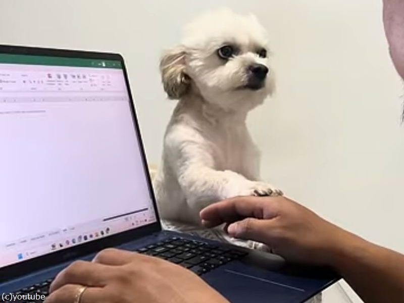 「困ったな、子犬のせいで作業がはかどらない…」困惑しつつも嬉しそうな飼い主さん(動画)