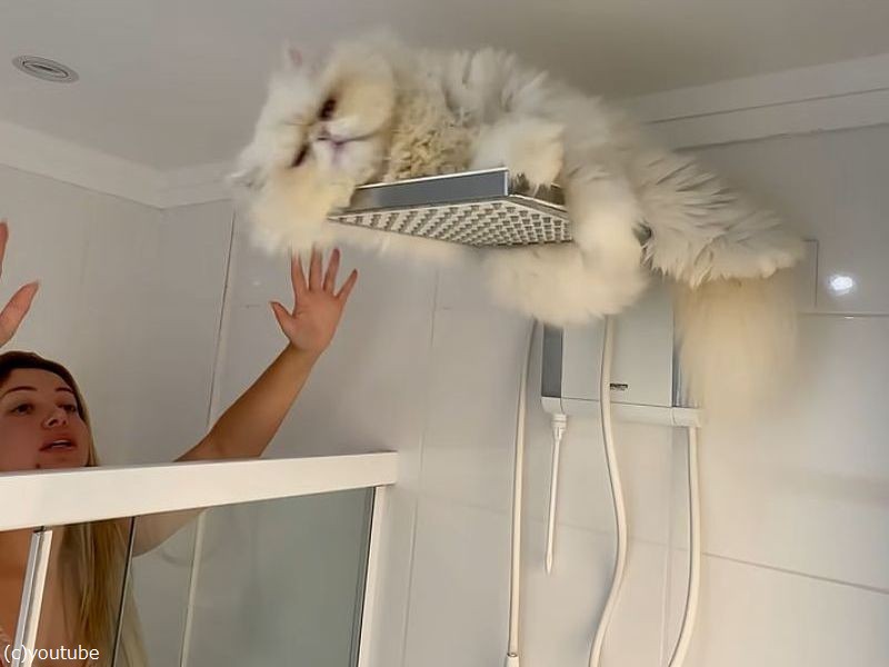 「なぜそこ!?」不機嫌なペルシャ猫がシャワーヘッドの上に寝そべっていた(動画)