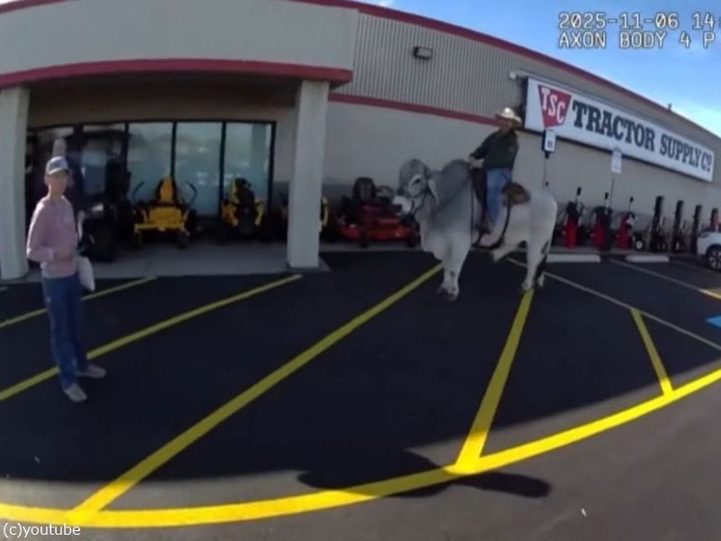 「オハイオ州の駐車場に牛に乗った男がいる!」警官が駆け付けると…ほのぼの展開に(動画)