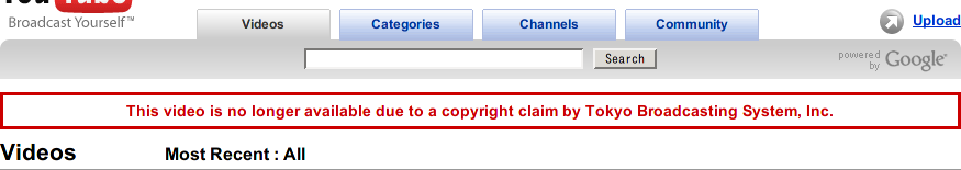 これは訳すとすると「このビデオは東京放送(TBS)による著作権侵害を訴える請求により、もう利用できません」ということで、要するに著作権のある動画だから消せとTBSがYouTubeに請求したので消されたということですね。