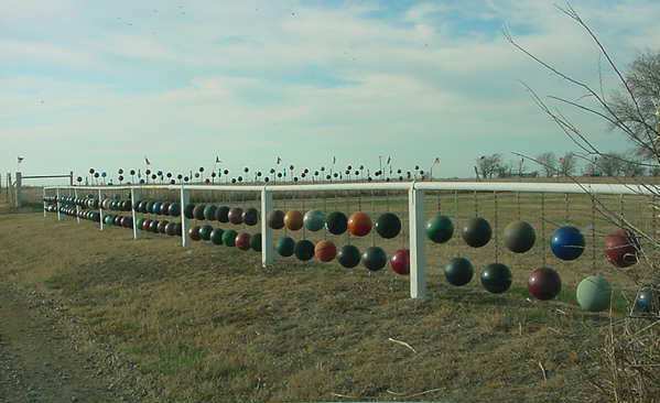 ボーリングの球フェンス。一見フェンスの役目果たすのか疑問ですが、ボーリングの重さなら家畜も通り抜けしないのかも。普通にフェンス立てたほうが安くつくんでは?とは考えないようにしましょう。