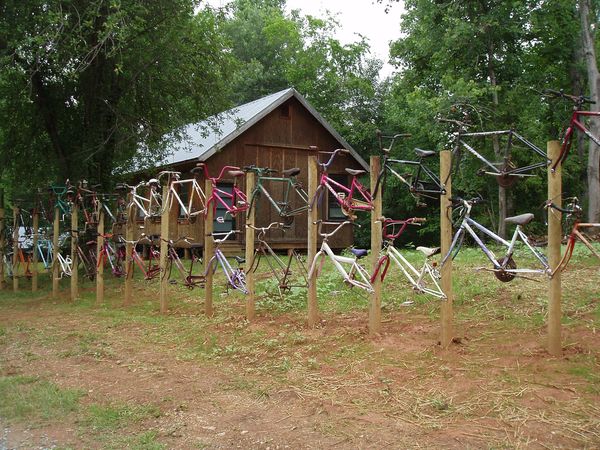自転車フェンス。これは材料がないというより、自転車好きによるものかな? カラフルだけど、やすやすと侵入されそうです。