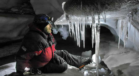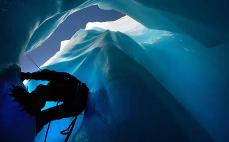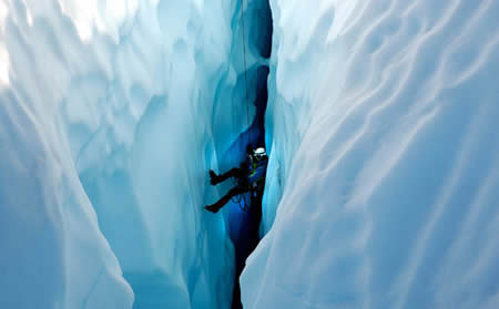 危険を省みず、氷のクレバスを降りていきます。
