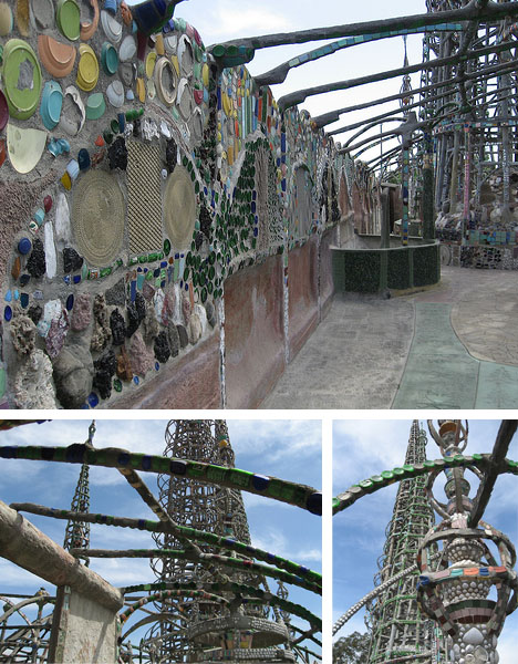 サイモンはイタリア移民で、ロサンゼルスに落ち着くまでいろいろな場所を転々としました。とりあえず最初は小さなアートプロジェクトのつもりでしたが、どんどん広がっていき、このワッツタワーと呼ばれる傑作を作り上げるまでに至りました。貝、メタル、破片、陶器、石、ガラス、雑多なもの、使えるものは何でも利用してゆき、約30mの高さまで足場なしに作り上げました。基本の構造はスチール、セメント、モルタル、ワイヤーで組み立ててあるそうです。