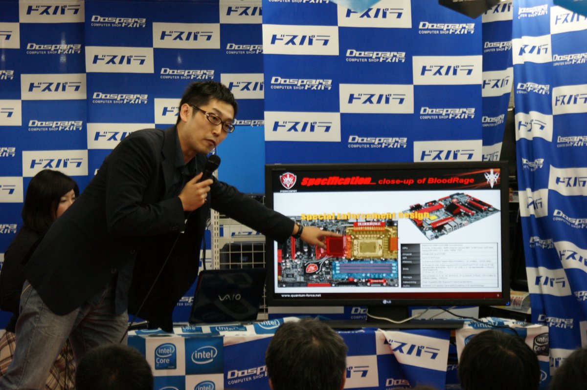 実は発売直前に不具合が発覚!一部の光学ドライブから起動できないBIOSの不具合があったそうですが、スタッフの必死の努力で修正済みとの報告です。しかしお約束なのか、会場も楽しそう。「2ちゃんねるに糞マザーと書かれてしまって…」などの自虐トークも飛び出し、会場は常に沸き立ちます。