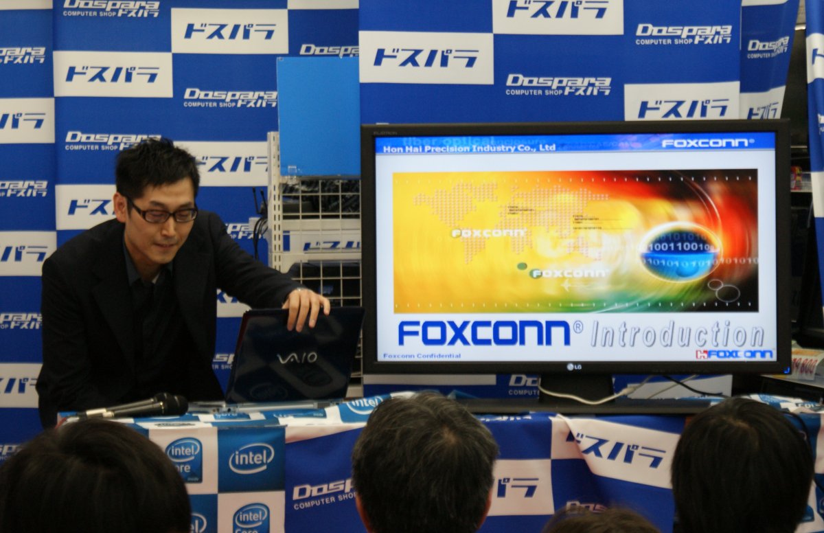 そしてマザーボードメーカー、Foxconn(フォックスコン)の説明が始まりました。英語でのプレゼンで、会場の反応はいまいちでしたが、気にせずに激しいトークが続きます。