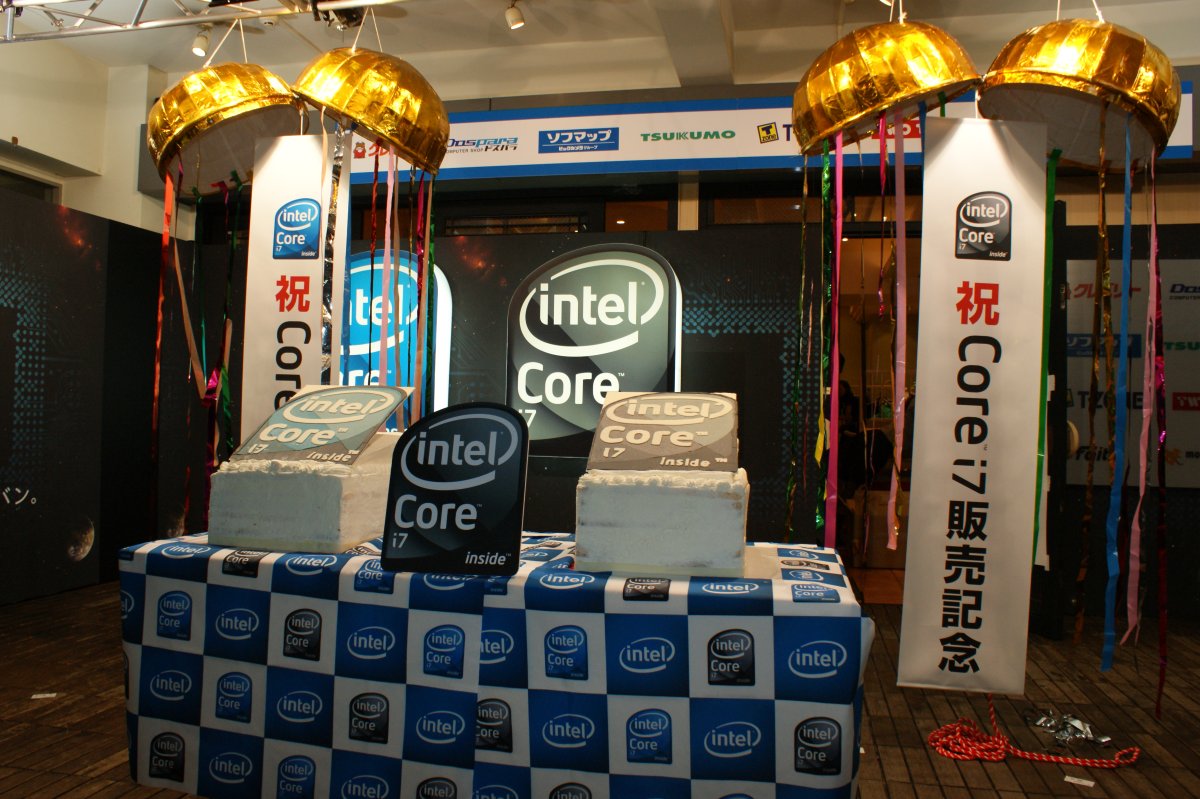 帰りがけにintelのブースで見つけた、core i7ケーキ。秋葉原はお祭りムードに包まれていました。ふとブースの脇をみると、カウントダウンタイマーにもたれかかる、ぐったりと疲れ切ったintelの天野氏の姿が…本当にお疲れ様でした。(失礼かと思い撮影はしませんでした)