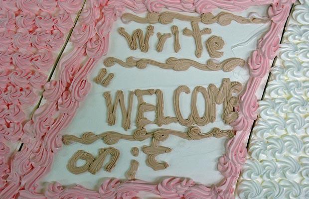 「"ウェルカム"と上に書いて」とケーキに書かれています。
