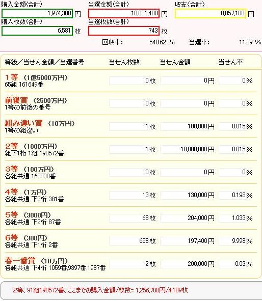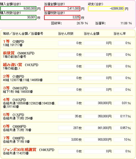 グリーンジャンボより1等が高額な分、その他の当たりが少なくなっているのもあり、回収率は30%切っています…。