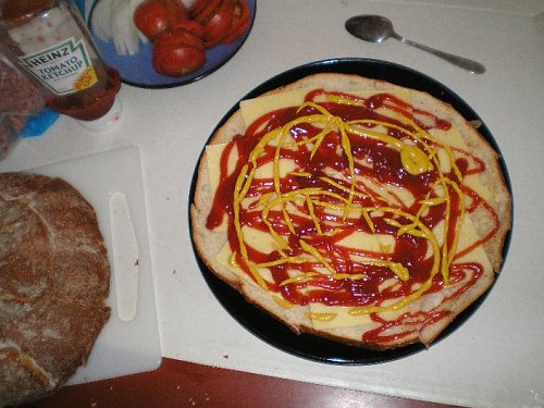 敷き詰めたスライスチーズに、ケチャップとマスタードたっぷり。
