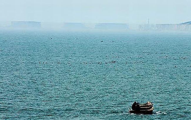 ボートの左側に岩山があり、右側は水平線…のはずが。