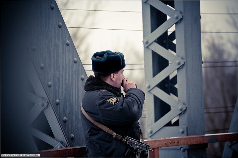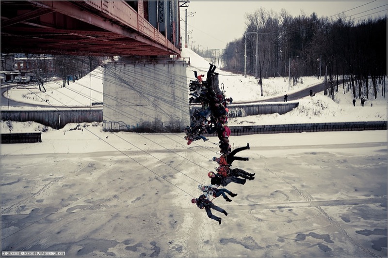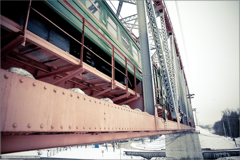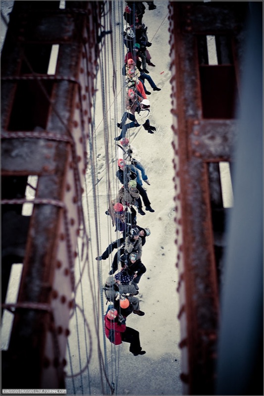 鉄橋の上のロシア人たち。危険すぎる行為ですが美女も混じっています。
