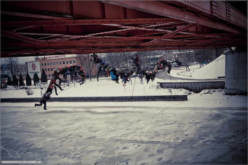 電車が迫りくる橋の上から集団で飛び降りる、かなり無茶なロシア人たち