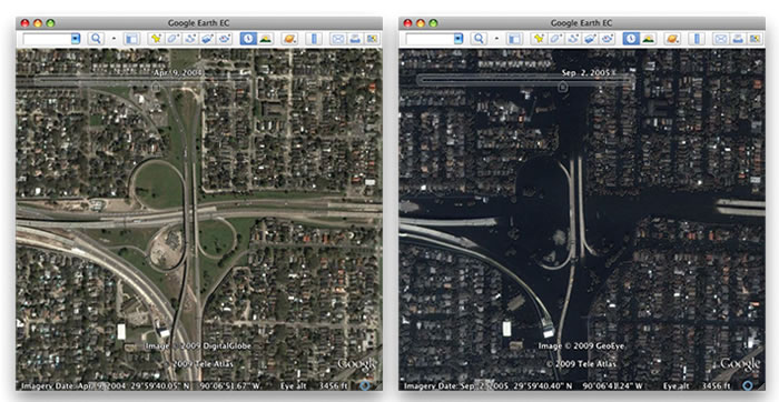 Google Earthの公式ブログで紹介されている、2005年8月末にアメリカ合衆国南東部を襲った大型のハリケーン・カトリーナがニューオーリンズに上陸する前後の比較。