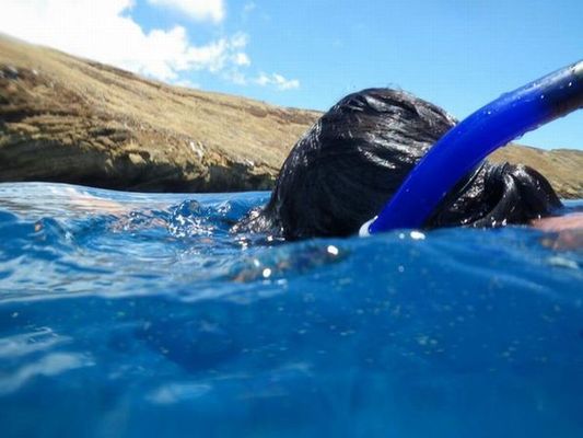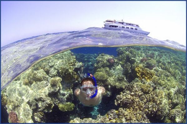 ゴーグルをつけてプールに半分潜ると、水面の上下がずいぶん違って見えますが、もし透明度の高い海だったら…。