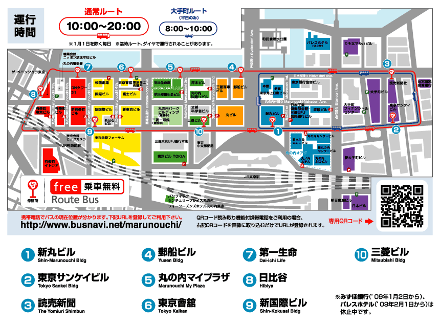 東京駅の前にある丸の内・大手町・有楽町地区では「丸の内シャトル」という無料バスが15分間隔で巡回しています。
