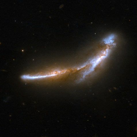 地球からはるか5億光年先で、右上の銀河と左下の小さな銀河が衝突して通り抜けたため、このような形になっているそうです。