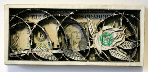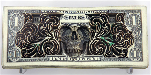 タトゥーの彫り師であるスコット・キャンプベル氏が、フロリダのギャラリーで出展したもので、レーザーカットエッチングを施した1ドル紙幣の束なのです。