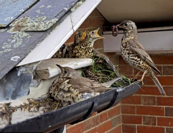 イギリスの屋根の裏側に住んでいるツグミの親子。