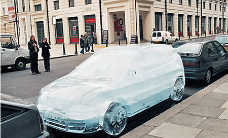 ロンドンの通りで彫刻家たちが350時間を費やし、9トンもの氷の塊を彫りこんで作り上げたのがこのフォルクスワーゲンです。ただし道路に置いて12時間で溶けてしまいました。イギリスの出版広告4週間分の価値はあったといいます。