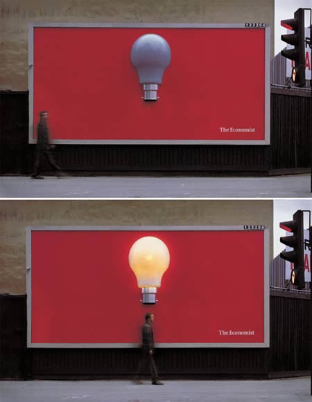 英紙エコノミストのこの広告は、ロンドンで催された国際広告賞(International Advertising Awards)で賞を取りました。モーションセンサーが埋め込んであり、誰かが通り過ぎるたびに電球が点くという仕組みだそうです。スクエアの某RPG好きの人にはたまらないアイデアかも。