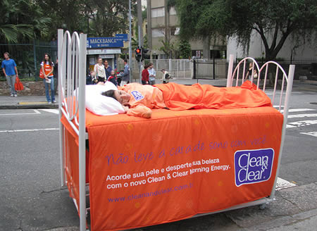 ゲリラ・パフォーマンスとしてブラジルのサンパウロで、歩くベッドの上に女性が寝ているという表現方法。このベッドは学校や大学内に早朝7時に置かれたそうです。ベッドには「その眠い顔のままで行くのはやめよう。お肌を美のために起こそう」と書かれています。