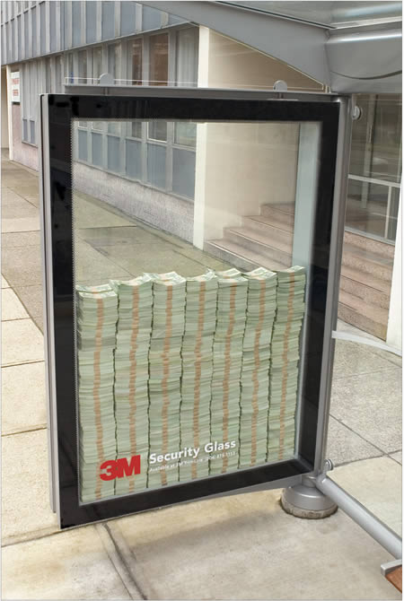 セキュリティガラスの強度がいかに高いかを証明するため、ガラスケースの間に札束を積み上げてバス停に設置したそうです。ただし本物のお金は500ドル分だけだそうで、上に見えているもの以外は偽札とのことです。足で蹴る以外の方法で不正に現金を持ち出されないよう、警備員もちゃんと横に立っていたそうです。