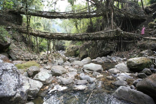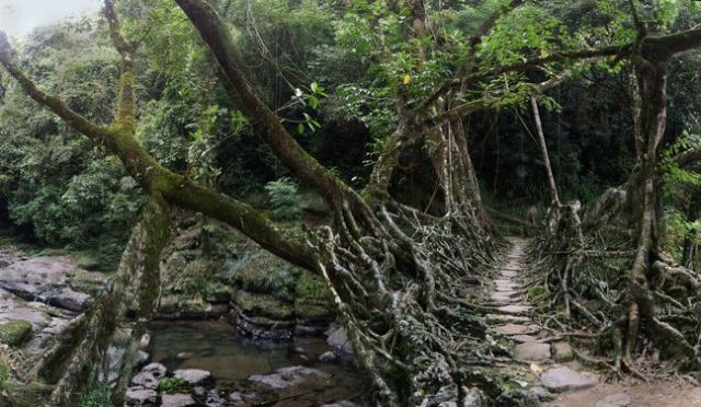 文字通り生きた木々の根が川の対岸へと伸び、10〜15年かけて人が渡れる橋になると言います。
