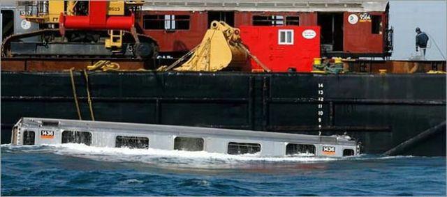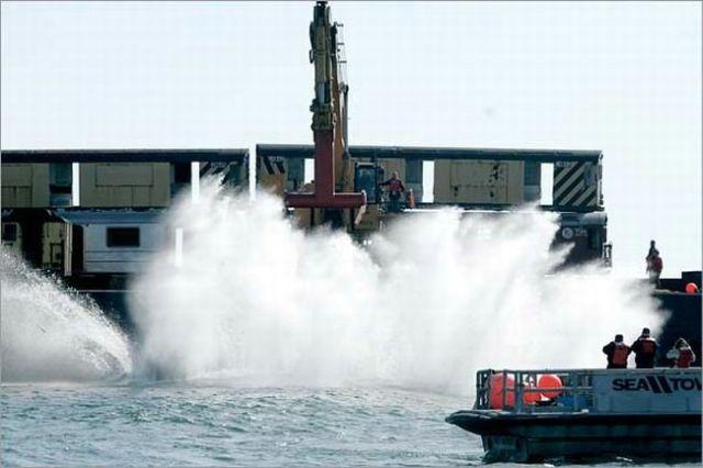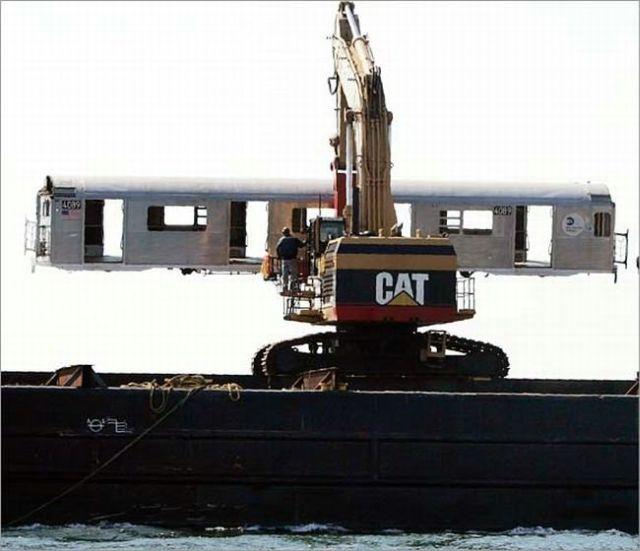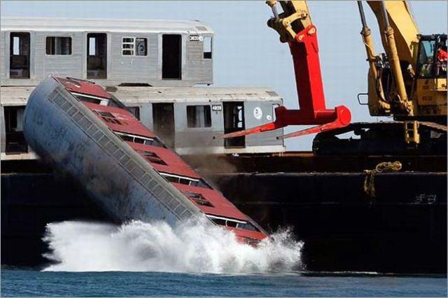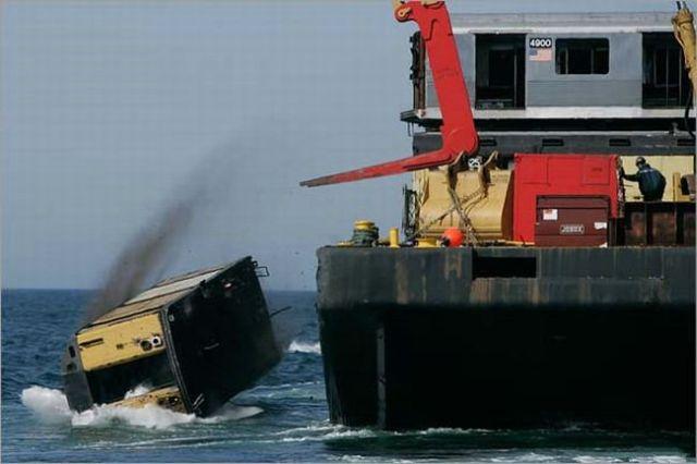 不要になった電車の車両を舟で運び、沖合にクレーンで放り投げている現場なんでの..