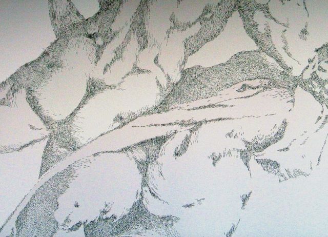 こちら、まるで鉛筆でデッサン描きした絵のようですが、ホッチキスの芯を刺しただけの作品です。
