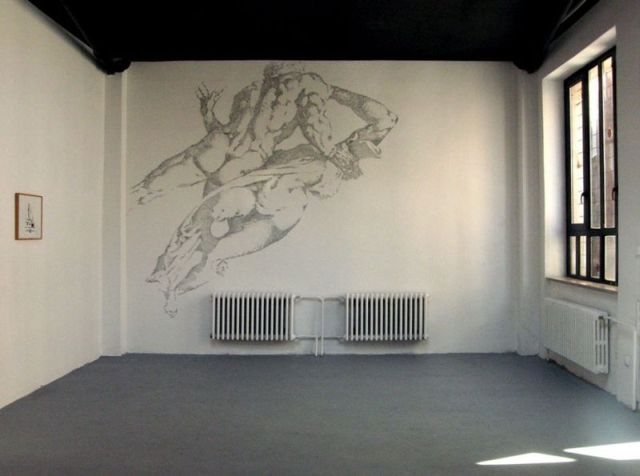 ホッチキス3万5千本…壁に刺して描いたルネサンス芸術のようなアート