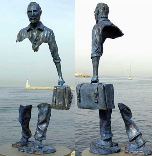 みんな手荷物を持った旅行者のような姿ですが、バッグに代わりに地球だったりと、いろいろなメッセージが込められているようです。