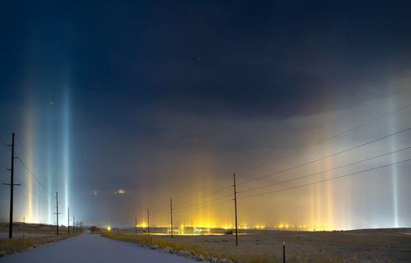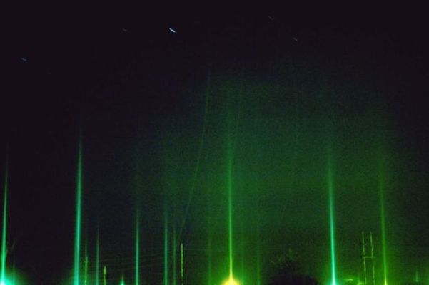 まるで地面から空に向かってライトを放射したかのようなこの光景、実は光柱(こうちゅう)またはライトピラーと呼ばれる、非常に珍しい気象現象だそうです。