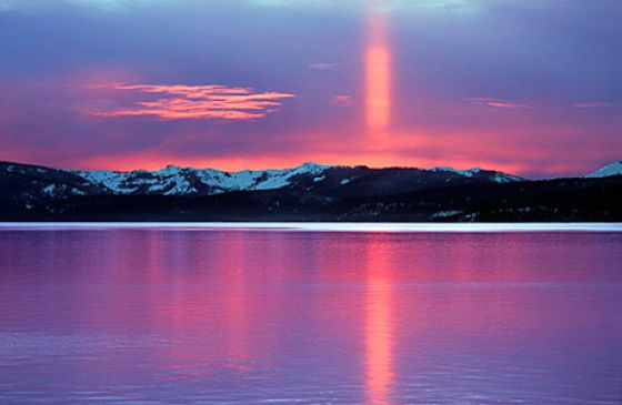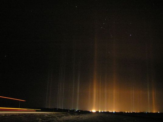 こちらは同じ理屈の気象現象、太陽柱。日出または日没時に見られ、サンピラーとも言うそうです。月の光によるものは月柱(げっちゅう)と呼ぶとのこと。