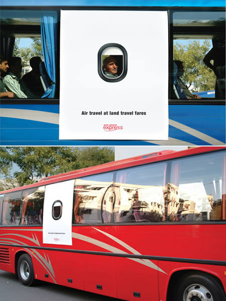 飛行機の窓のようにして、「陸の料金でエアートラベル」と売り出す手法。