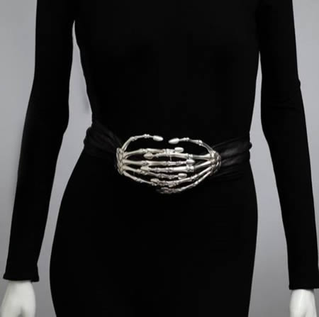 一見するとシルバーのファッショナブルなジュエリーベルトに見えますが、よくよく見るとギョッとする仕組み。このユニークなガイコツ・ベルトは、着ける人の個性やスタイリッシュさを引き出してくれることでしょう。イタリアのデザイナーによる作品で、ガイコツの指でロックされる構造も秀逸です。