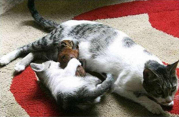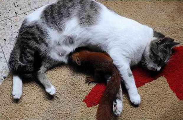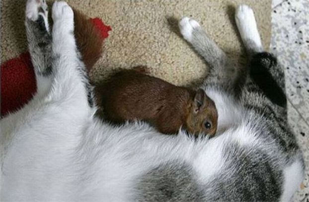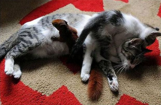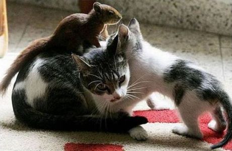 しかしながら、猫の親子と子リスという風変わりな組み合わせだけれど、とても仲良く暮らしている3匹がいました。