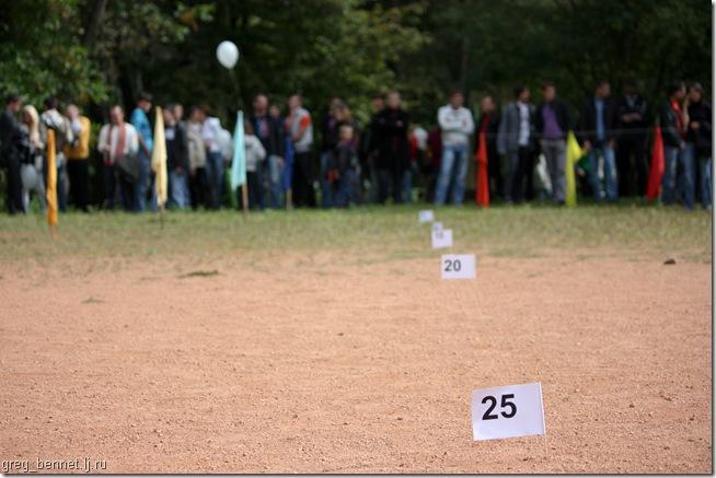 陸上の投擲競技のように、グランドには距離を示す旗が立っています。