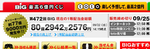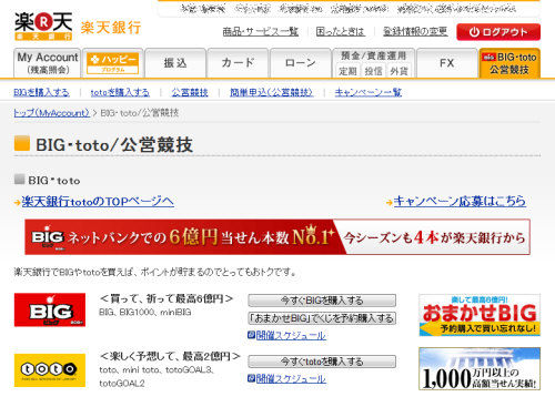 ちなみにBIGの購入は、toto公式サイトやコンビニ、toto売り場の他に、楽天銀行(旧イーバンク銀行)で購入する事も。私もたまにBIGを購入しますが、当せん金が勝手に口座に振り込まれるのが便利で、いつも楽天銀行を利用しています。残念な事に当せん金が振り込まれた事はまだ一度もありませんが…。