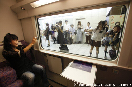 この写真は、カシオペアでの撮影の一コマ。旅情たっぷりで大宮駅を通過すると、ホームには通勤や通学のお客さんが大勢いて、手を振られたそうです。ちょっと気恥ずかしそうですね…。