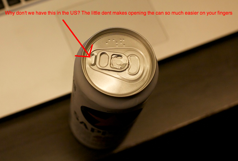 プルトップの小さな溝を指して、「どうしてアメリカではこれと同じことをして開けやすくできないんだ」と書かれています。