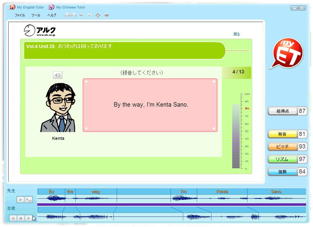 ところが、アルクから発売されたスピーキング練習教材の「 MyET 」( My English Tutor:英語の家庭教師という意味)は、人に代わってパソコンが発音を判定してくれるのだとか。うーん、でもパソコンに発音の評価なんてできるの…?