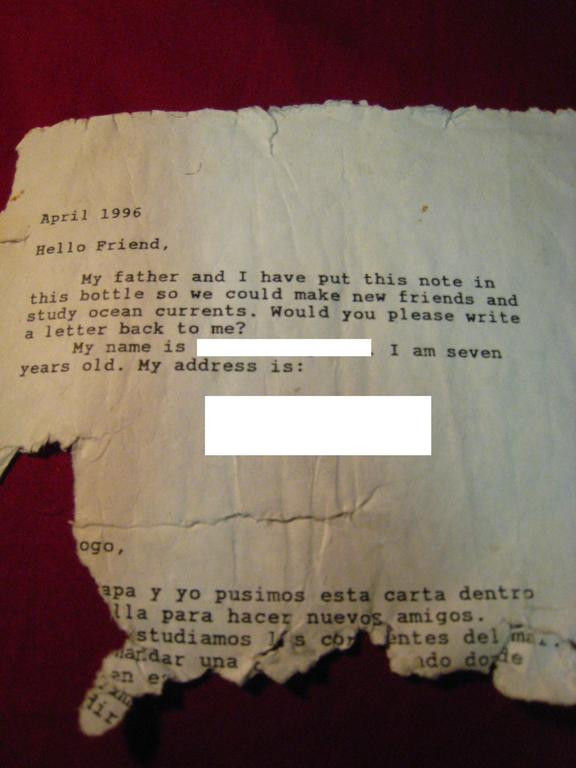 In April 1996 I dropped bottles with notes into the Pacific Ocean. I got one back today.