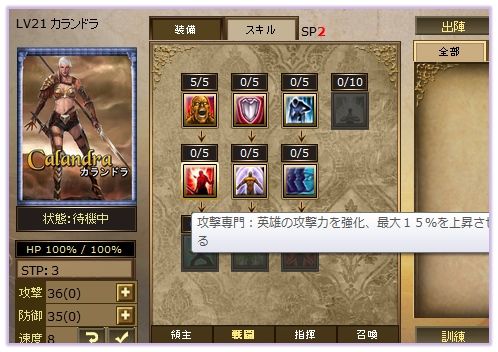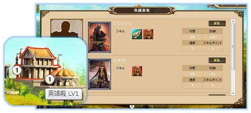 そして、兵を率いる英雄もまた重要。城の英雄殿にて英雄を雇用し、じっくり育成しましょう。英雄は戦闘や訓練でレベルが上がり、攻撃力、防御力などを好みで強化できます。