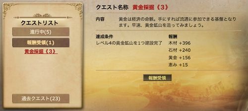 序盤は「Lv3の採石場を作れ」といったクエストが多数用意されているので、まずはクエストをクリアしていくように建造していくと、スムーズに進行するようです。達成すると報酬として資源をもらえるので、序盤は殆ど資源に困ることなく、サクサクと成長が進みます。