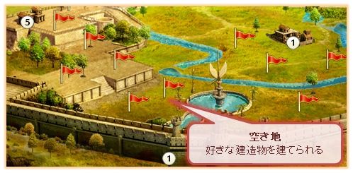マップ上にはいくつかの空き地があり、好きな種類の建造物を建築することができます。なので例えば生産力重視なら倉庫を大量に建造、戦力重視なら神殿・訓練所を重点的に建造…など、自分のプレイスタイルに合わせた城作りが楽しめます。