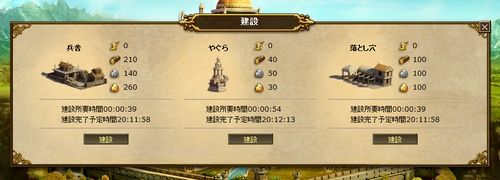 また、攻めこまれた時に防衛力を高める城壁ややぐら、落とし穴、兵士を中級・上級兵士にする訓練所などの建造も重要。