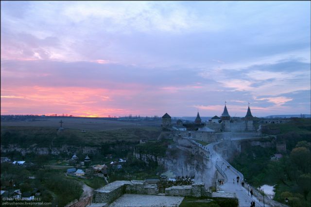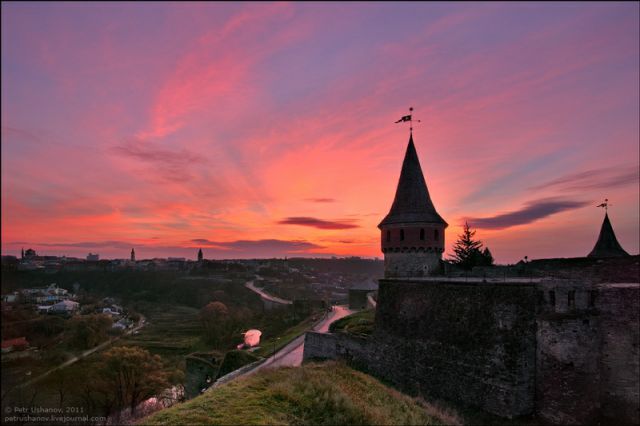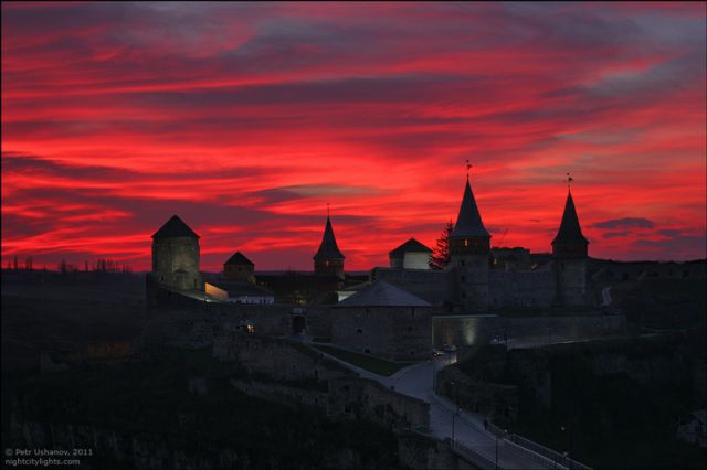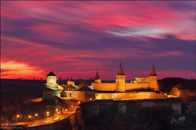 夕暮れ時に映えるカームヤネツィ=ポジーリシクィイの美しい古城をご覧ください。