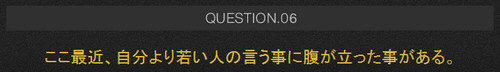 ちなみにこの「ここ最近、自分より若い人の言う事に腹が立った事がある。」という質問、Yesだったのですが、ふと最近の自分に寛容さがなくなっていることに気付かされました。