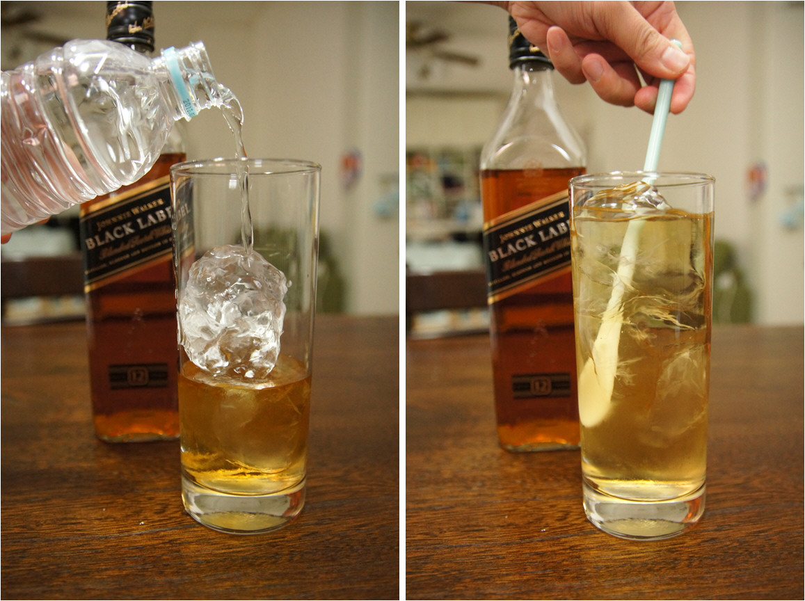 グラスに人差し指1本分くらいの高さまでジョニーウォーカーを注ぎ、ロックアイスを入れ、自分が飲みやすくなるくらいまで味見をしながら水を注ぎ、キンキンに冷えるまでしばし待つこと2〜3分。